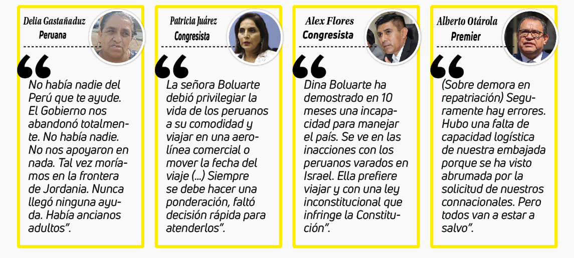 Han pasado ocho días desde el primer ataque del grupo islamista Hamás a Israel y hasta la fecha el gobierno de la presidenta Dina Boluarte Zegarra no repatrió a ninguno de los más de 100 peruanos que piden auxilio. Por el contrario, ocho de ellos llegaron ayer al Perú por sus propios medios tras 30 horas de viaje y exponer su vida.