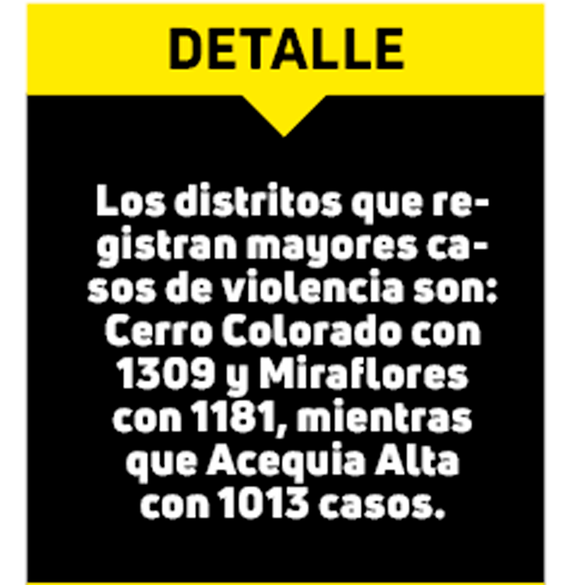 Los distritos que lideran las ocurrencias violetas son Cerro Colorado (1309) y Miraflores (1181), solo en el 2022, declaró la promotora de Emergencia Mujer Arequipa, Nayda Torres Enríquez.