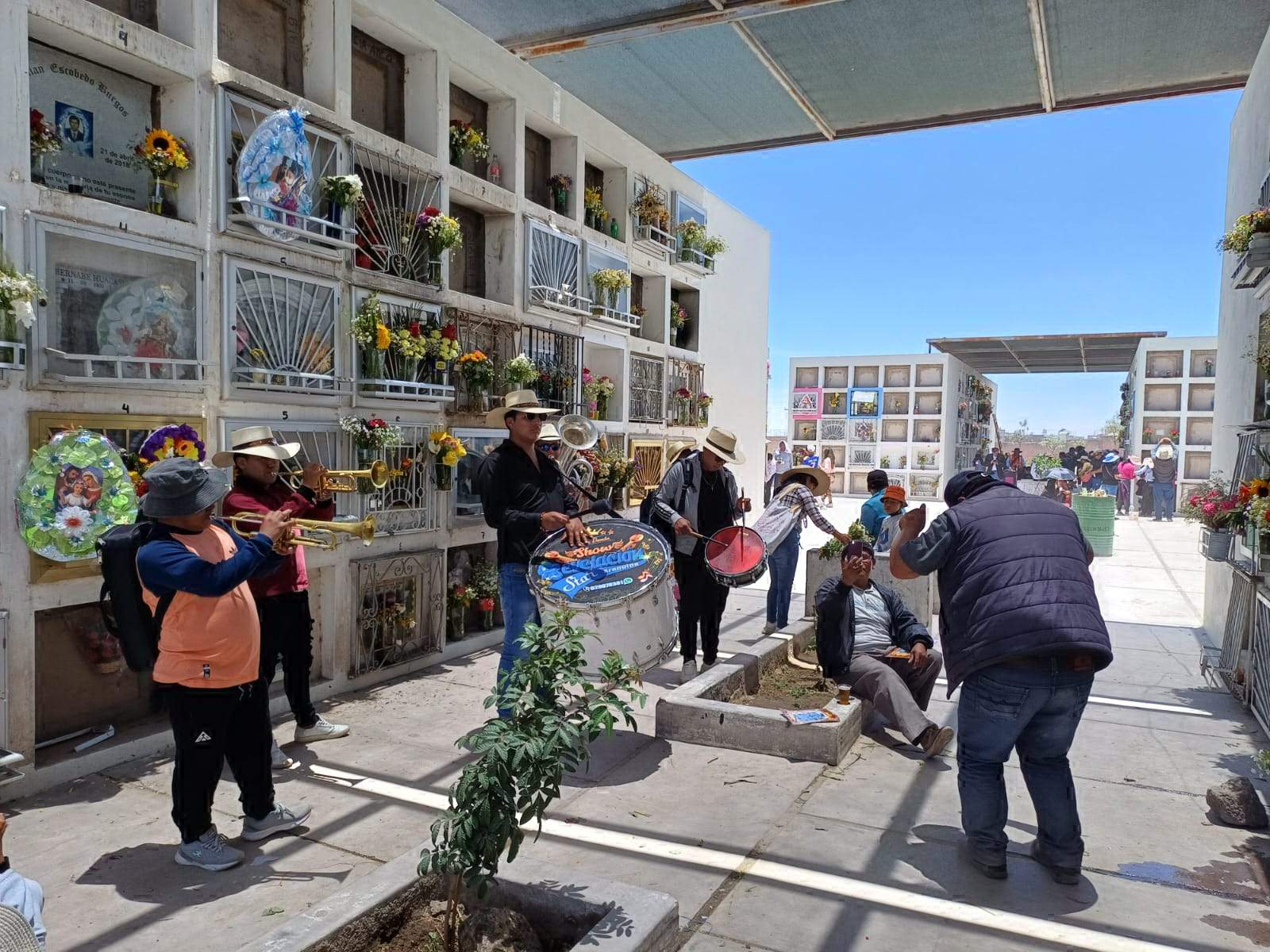 Germán García murió hace tres años, víctima de una herida  gangrenada en la pierna derecha y su cuerpo descansa en el cementerio Paz Eterna, situado en el sector Ciudad Municipal del distrito de Cerro Colorado. Hasta ahí, en el Día de Todos los Santos, arribaron sus dos mejores amigos,  Lucrecio Mamani (48) y Nicolás Pocco (56), para visitar su nicho y recordarlo escuchando un par de pasodobles folclóricos, una de las músicas favoritas del finado. Para ello, solicitaron los servicios de Edson Ranilla (26) y su banda ‘Revelación Star’, quienes recorrían, con tambor, bombo, trompeta y bajo,  por los pasadizos de los pabellones de la zona izquierda baja del recinto. Es el segundo año consecutivo que la banda acude al camposanto más grande del Cono Norte, pero el sexto de su constitución como agrupación que ayer, puso a bailar y sollozar a decenas de familias.