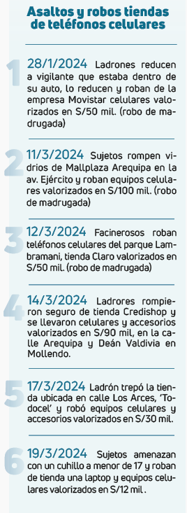 Los asaltos y robo a mano armada a tiendas donde venden celulares no cesan en la región Arequipa. En lo que va del 2024 a la fecha ocurrieron seis asaltos y solo en marzo los ladrones hurtaron dentro de centros comerciales.