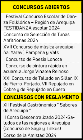 Son alrededor de 20 actividades que la comisión de festividades realizará desde julio iniciando con el concurso de las danzas escolares. “Dos actividades se realizarán por terceros: la serenata por la ciudad y reinas de la ciudad. En la serenata tenemos 4000 entradas; 2000 a través de una donación y 2000 que serán gratuitas para la población de Arequipa”, expresó Ismael Samos.