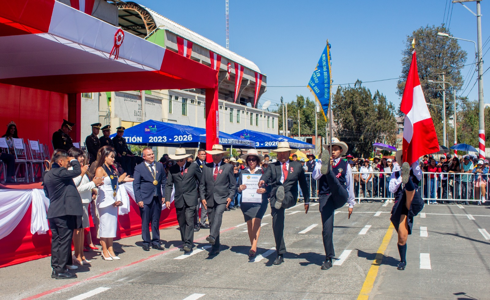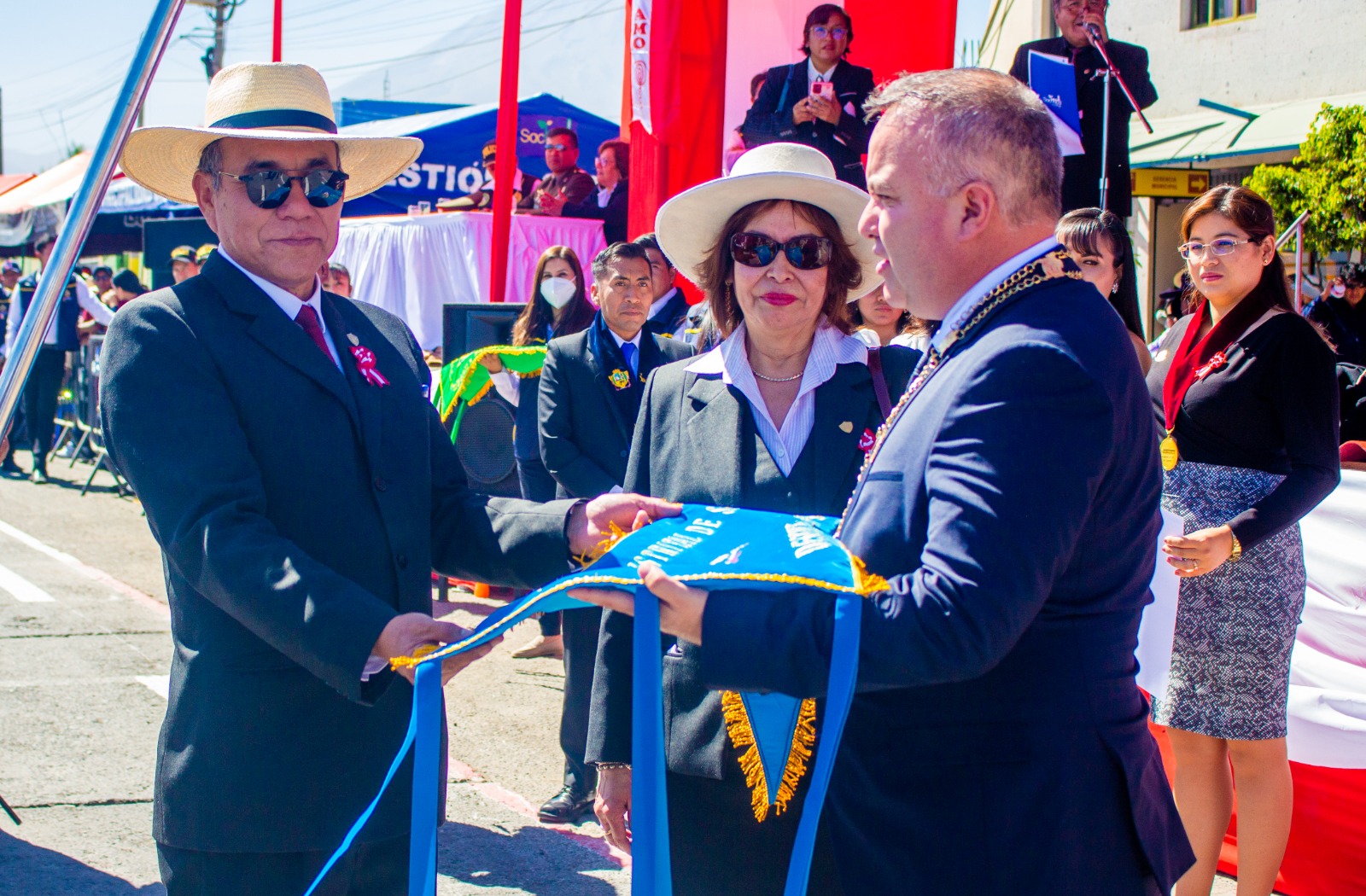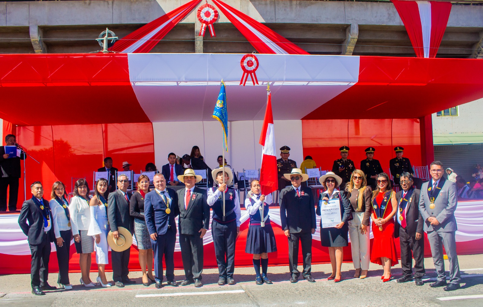El alcalde distrital, Renzo Salas Herrera entregó el distintivo al plantel, que se caracterizó por la presentación de su delegación, presencia de escolta, paso de brigadieres; mostrando marcialidad y gallardía en su paso en la avenida Fernandini, que fue el escenario del desfile escolar que se realiza después de tres años, tiempo en el que se suspendieron las actividades de concentración de escolares por la covid-19.
