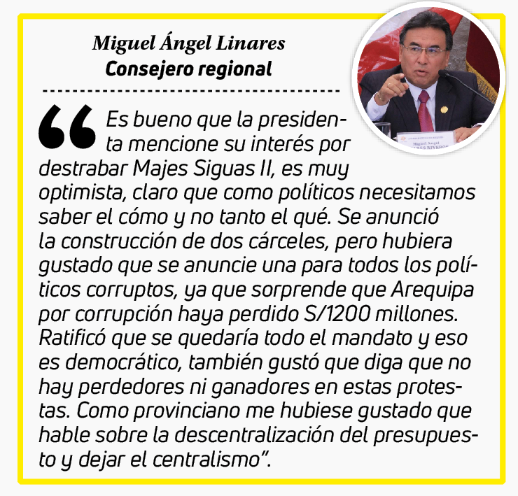 “En la mayoría de veces los congresistas hacían cosas negativas como gritos e interrupciones, en esta oportunidad todo se desarrollo de manera normal. Mencionó mucho más al norte que al sur del Perú, en Mollendo nos quedamos cortos”, señaló.