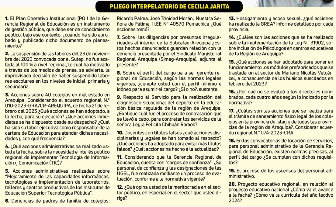El pleno del Consejo Regional de Arequipa (CRA) sesionará hoy a las 16:30 horas en forma extraordinaria para ejecutar la interpelación de la gerenta regional de Educación, Cecilia Jarita, quien deberá responder un pliego de 20 preguntas y si no convence a los integrantes del legislativo regional podría perder el cargo de confianza dado por el gobernador Rohel Sánchez Sánchez.