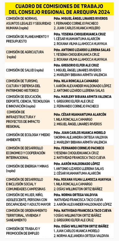 Tiembla la gestión de Rohel Sánchez Sánchez al mando del Gobierno Regional de Arequipa (GRA). Ayer durante la primera sesión ordinaria del 2024, el pleno del Consejo Regional de Arequipa (CRA) aprobó la distribución de las 14 comisiones de trabajo entre los fiscalizadores. Lo curioso es que cinco de estas carteras tendrá al mismo presidente del 2023, pese a que no se obtuvieron grandes resultados.
