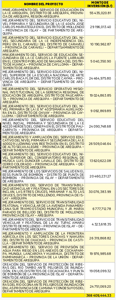 Quispe Tito espera que el Consejo Regional de Arequipa (CRA) apruebe este viernes en sesión extraordinaria el dictamen de propuesta de acuerdo regional para la “Actualización de la Cartera de Proyectos por el Mecanismo de Obras por Impuestos”. Así se podría dejar en cartera dicho trabajo para empresas interesadas en invertir para el 2023.