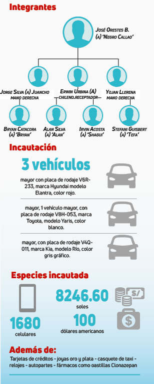 INTERVENCIÓN. La noche del jueves 16 de noviembre a las 20 horas ingresaron más de 20 efectivos policiales a las viviendas ubicadas en los distritos mencionadas. En el domicilio de sector de Miguel Grau en el distrito de Paucarpata, Erwin Urbina (a) chileno, la Policía le halló 1600 celulares hasta en los colchones y compartimentos alternos. También a los presuntos facinerosos se les halló tarjetas de crédito, joyas y dinero (Ver infografía).
