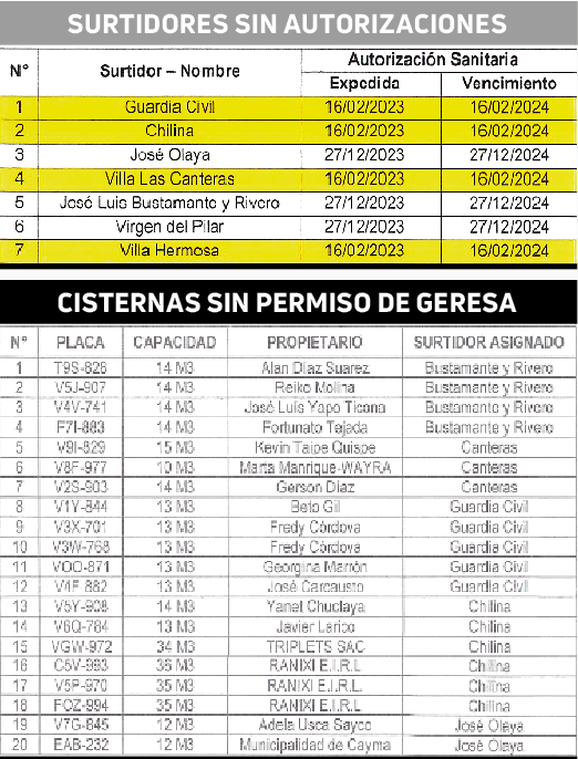 “Se debió adquirir dos camiones cisterna el pasado 26 de enero (antes de la crisis). Además hay 72 proveedores que alquilan los camiones, pero la entidad no sostuvo un acuerdo, contrato o convenio, para que estos atiendan durante una emergencia. También se reveló que 20 de estas unidades no tuvieron permisos del área de Salud Ambiental de la Gerencia Regional de Salud de Arequipa (Geresa)”, se lee.