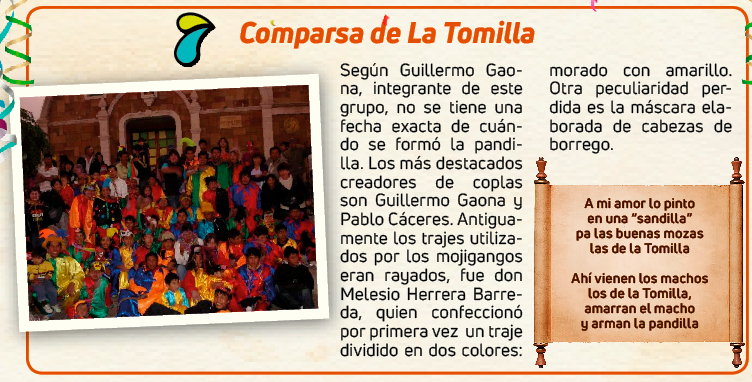 Las comparsas están integradas por los mojigangos y los músicos, los primeros lucen trajes de colores, máscaras, un cono llamado tongo, que va en la parte superior de la cabeza y un zurriago, con el que “castigan” a los espectadores menos animados. Los mojigangos bailan al compás de la música y echan polvos, mistura y serpentina a los presentes.