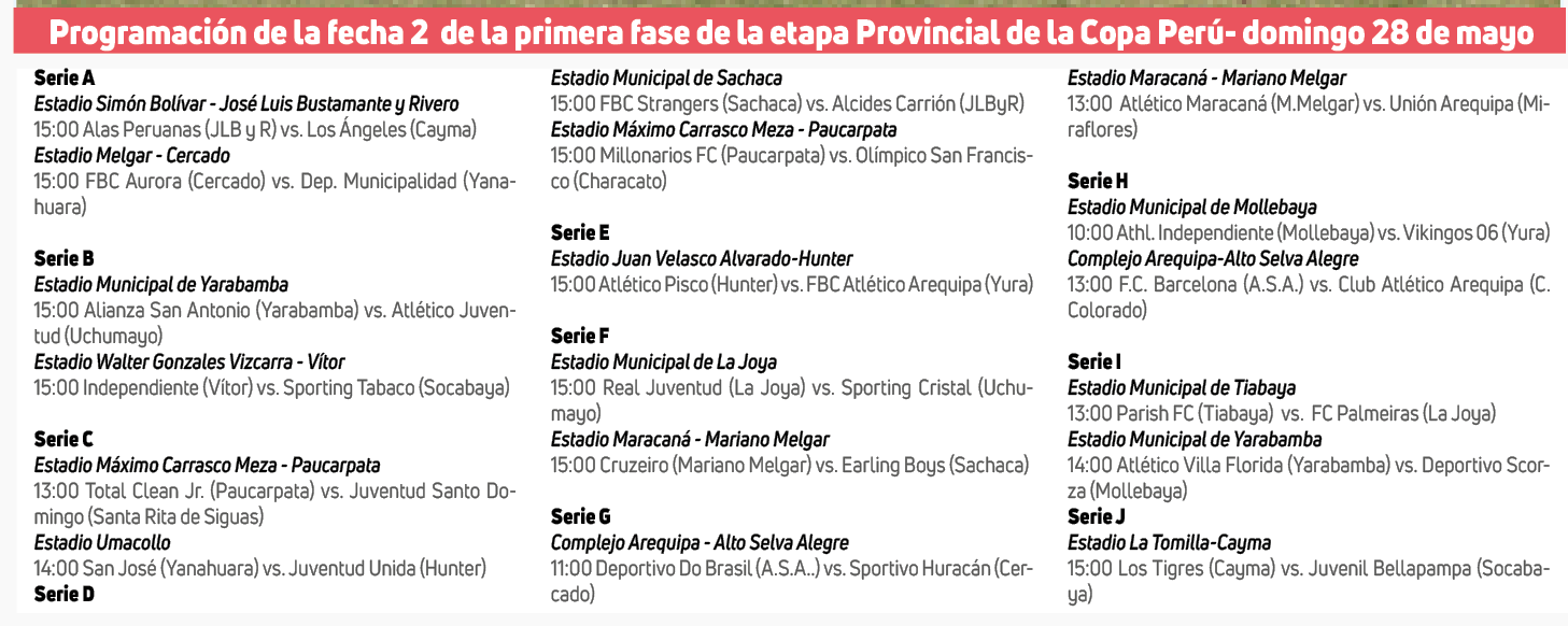 Este domingo se completará con 17 partidos la segunda fecha de la primera fase de la etapa Provincial de la Copa Perú, en la que algunos equipos asegurarían el boleto a la segunda ronda del certamen que organiza la Liga Provincial de Fútbol de Arequipa.