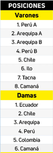 Por su parte, la escuadra de Arequipa B, que en la primera y segunda  jornada de la ronda de grupos, batió  2-0 (9-3/17-6) a Camaná y 2-1 (9-14/14-13/4-2) a Chile, respectivamente, chapó el tercer lugar luego de batir en un choque definitorio 2-0 (16-6/10-6) a Perú B, afincado en el cuarto puesto.