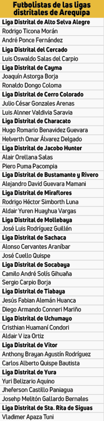 Lamentablemente los presidentes Godofredo Fermín Cervantes Midolo de Mariano Melgar, Daveyva Katherine Chalco Noa de Yarabamba, Walter Horacio López Valderrama de Yanahuara, Miguel Ángel Rueda Yato de Paucarpata y Segundo Fortunato Palomino Ocsa de La Joya, pese a solicitarles en más de una oportunidad, no enviaron los nombres de jugadores de las indicadas ligas.