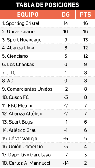 Con relación a otros clubes, al Alianza Lima le pusieron el freno. Fue ADT, que en Tarma batió 2-0 a los ‘íntimos’ para propinarle su segunda derrota en la temporada. Pese a ello los blanquiazules andan en el cuarto peldaño tras quedarse con 12 puntos, los mismos que Cienciano, que por diferencia de goles se posiciona quinto.