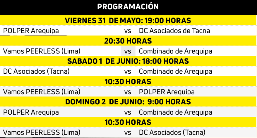 El referido cuadrangular de voleibol masculino se disputará íntegramente en el coliseo El Niño del distrito de Mariano Melgar con un programa establecido que se iniciará el viernes 31 con dos partidos donde se apreciará el alto nivel técnico de los jugadores visitantes y locales
