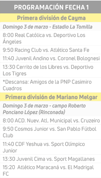 La fiesta de la Copa Perú en la provincia de Arequipa romperá fuegos en su etapa distrital este domingo 3 de marzo. Son cuatro ligas de fútbol las que pondrán en marcha sus campeonatos de la primera división: Cayma, Mariano Melgar, Alto Selva Alegre y José Luis Bustamante y Rivero.