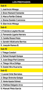 Los cinco primeros de cada categoría se hicieron acreedores a sus respectivos premios.  En el caso de los menores ellos se llevaron trofeos, juegos y libros de ajedrez, medallas y diplomas, mientras que los mayores recibieron dinero en efectivo.