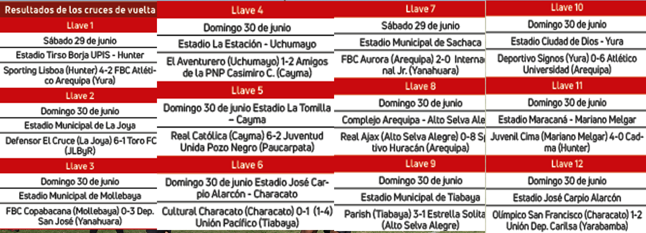 En tal sentido, el cuadro verdolaga aseguró su pasaporte a la tercera ronda, pues en la ida había vencido 2-0. La lista de doce equipos clasificados a la siguiente fase se completa con Sporting Lisboa (Hunter), Defensor El Cruce (La Joya), Deportivo San José (Yanahuara), Amigos de la PNP Casimiro Cuadros (Cayma), Real Católica (Cayma), Unión Pacífico (Tiabaya), FBC Aurora (Arequipa), Parish (Tiabaya), Atlético Universidad (Arequipa), Juvenil Cima (Mariano Melgar) y Unión Deportivo Carilsa (Yarabamba).