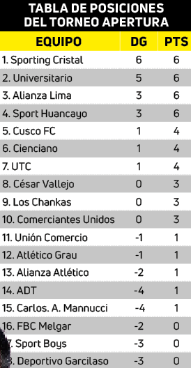 Expirada la segunda jornada del Torneo Apertura, Sporting Cristal, Universitario, Alianza Lima y Sport Huancayo comandan la clasificación tras cosechar seis puntos cada uno.