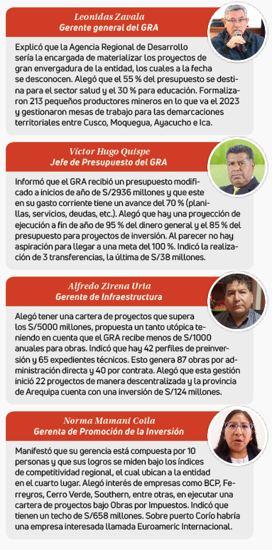 Fueron solo 6 gerencias quienes brindaron los detalles de su trabajo, en esta ocasión no fue invitado el presidente del Consejo Regional de Arequipa (CRA), Miguel Ángel Linares a diferencia de la última audiencia de Chala (Caravelí).