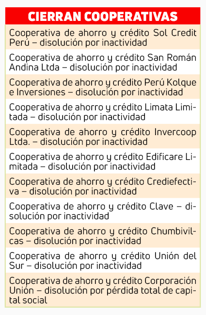 El 15 de setiembre, la Superintendencia de Banca, Seguros y AFP (SBS) informó sobre el cierre de ocho cooperativas de ahorro y crédito y ayer viernes 22 se sumaron otras instituciones financieras más a la lista de disolución y una de ellas es por “pérdida total del capital social y de la reserva cooperativa”.