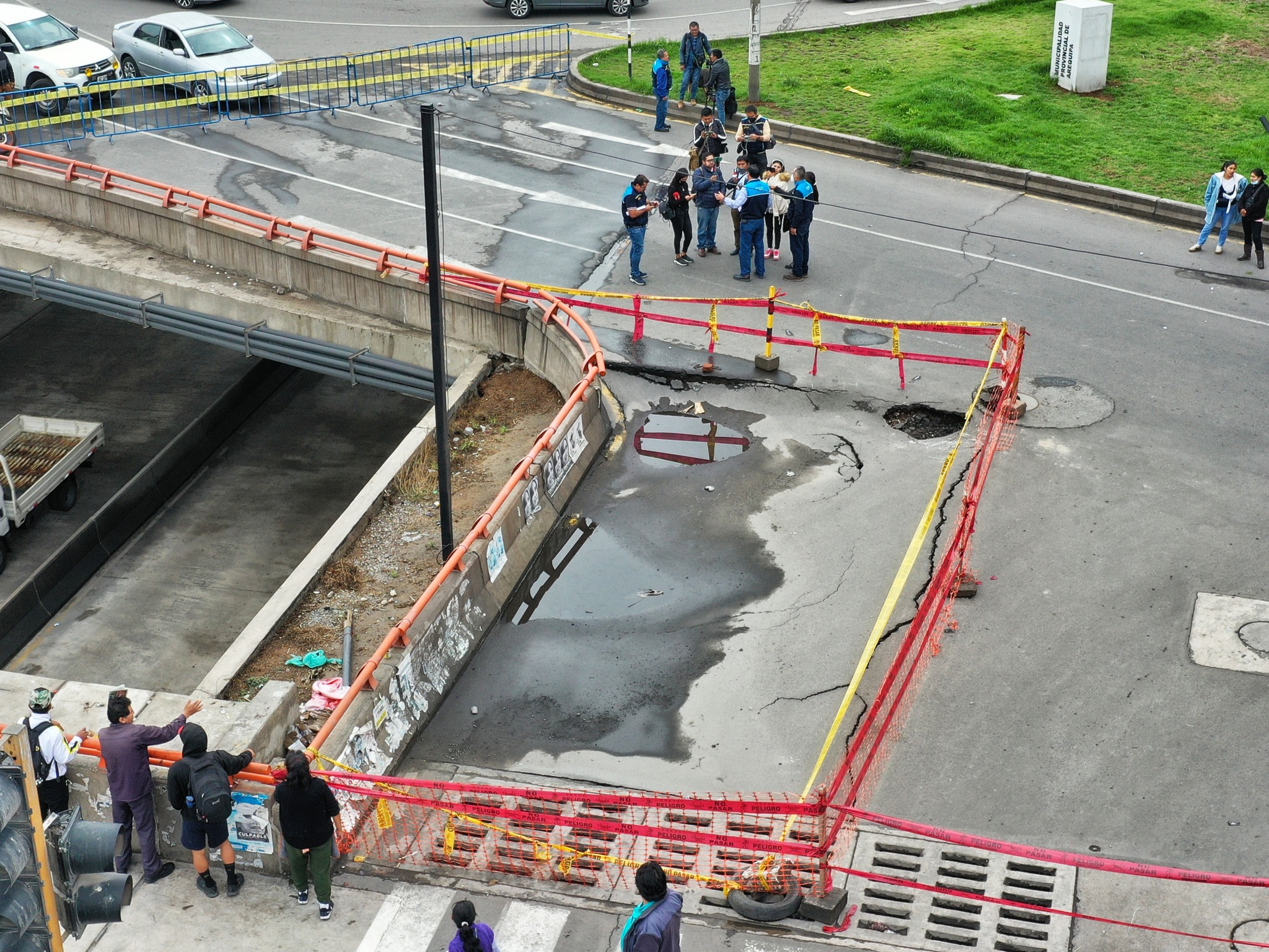 Diario Viral estuvo presente en el hecho y conversó con los comerciantes de los negocios cercanos a la zona dañada. Estos mostraron su preocupación puesto que la carpeta asfáltica podría colpasar. Actualmente el hundimiento de aproximadamente de 30 centímetros, se aprecia que el muro de la baranda del baipás también está con grietas como se puede observar en las fotografías.