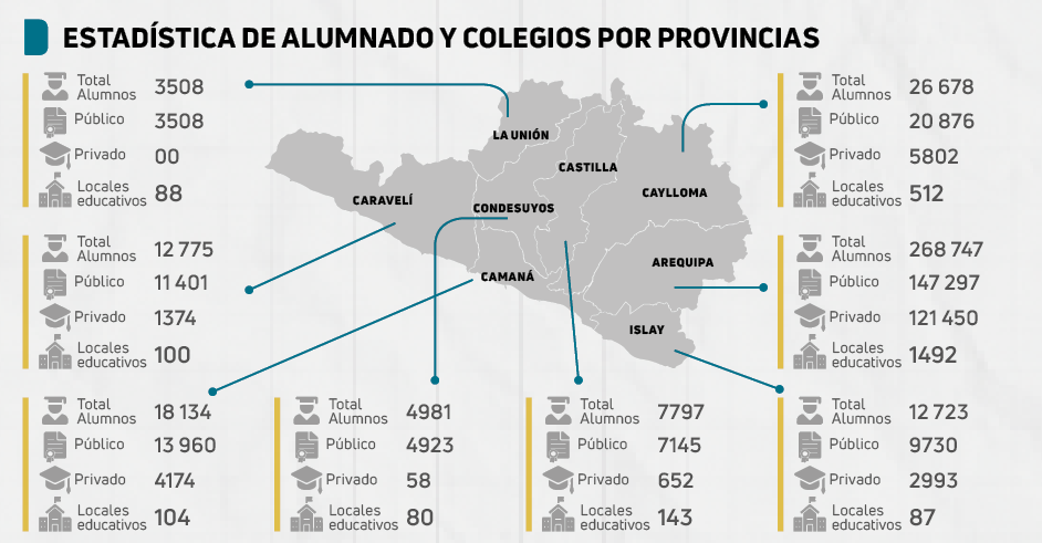 Desde este lunes 17 de marzo, cerca de 355 mil estudiantes arrancan el año escolar 2025 y a la fecha, la Gerencia Regional de Educación de Arequipa (GREA) y las 10 Unidades de Gestión Educativa Locales (UGEL), continúan la búsqueda de 45 mil alumnos, cifra faltante para llegar a la meta de 400 mil educandos propuestos por el gobernador de Arequipa, Rohel Sánchez.