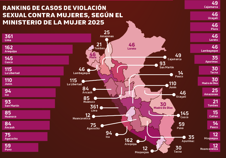 Además, Arequipa ocupa el segundo lugar en casos de abuso sexual a nivel nacional, solo después de Lima. Los datos del Programa Aurora revelan que en enero y febrero de 2025, los centros de emergencia mujer (CEM) de Arequipa atendieron 162 casos de violación sexual contra la mujer. (Ver infografía)