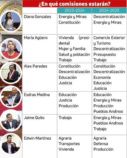 En caso de Diana Gonzales, en el período 2022-2023 estuvo a cargo de la Comisión de Descentralización y uno de sus proyectos que promovió fue declarar como patrimonio cultural de la nación la casa de Mariano Melgar. El año pasado no obtuvo ninguna presidencia, pero fue titular en Energía y Constitución; ahora también formará parte de la primera comisión y de Descentralización.