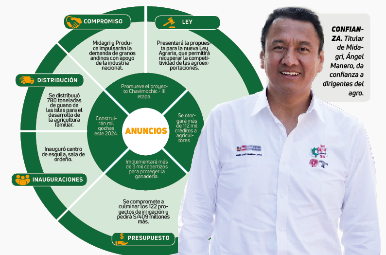 Manero Campos lleva 18 días como ministro y sus primeras acciones fueron reuniones con dirigentes de la Junta de Usuarios de Agua y otros dirigentes del agro. Entre sus promesas al momento de asumir fue continuar con el proyecto Chavimochic etapa III y promover una nueva ley agraria (ver infografía).
