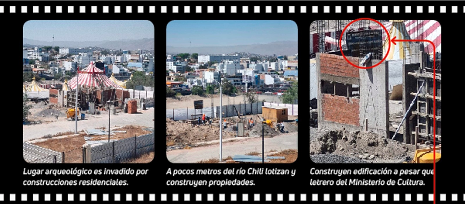 La denuncia llegó a Diario Viral, en imágenes se observa como solo a metros de las riberas del río Chili, hay lotización y edificaciones siendo construidas al costado del letrero que detalla que la zona es un monumento arquelógico intangible.