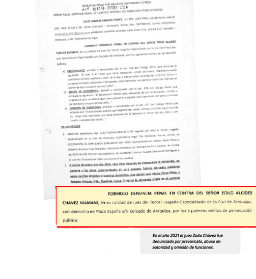JUEZ DENUNCIADO. Linares Mayhuire señala que teniendo “todos estos antecedentes y el mal accionar del magistrado Zoilo Alcides Chávez Mamani en su calidad de juez del Tercer Juzgado Especializado en lo Civil de Arequipa”, la parte demandada lo denunció por prevaricato, abuso de autoridad y omisión de funciones ante el Ministerio Público (Cuarta Fiscalía Superior Penal), caso 604-2021-228 y ante la Oficina de Control de la Magistratura (ODECMA) Expediente 884-2021, firmas falsas.