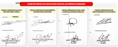 Otro acto escandaloso y arbitrario provocado por el juez denunciado Zoilo Chávez en el mismo expediente, es el que a inicios del año 2016 (dos años después de interpuesta la demanda), los demandados fueron alertados que Héctor Pérez Pérez y Roberto Antonio Frías Martínez, quienes figuran en la demanda, nunca habrían firmado el documento y que las rúbricas habrían sido falsificadas en Arequipa. Con la advertencia se compararon las firmas con los documentos de identidad donde a simple vista se notaron las grandes diferencias. (Ver fotos).