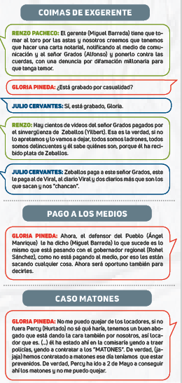 “Ahora, el defensor del Pueblo (Ángel Manrique) le ha dicho (Miguel Barreda) lo que sucede es lo mismo que está pasando con el gobernador regional (Rohel Sánchez), como no está pagando al medio, por eso sacan cualquier cosa. Ahora será oportuno también para decirles”, se escucha en el audio.