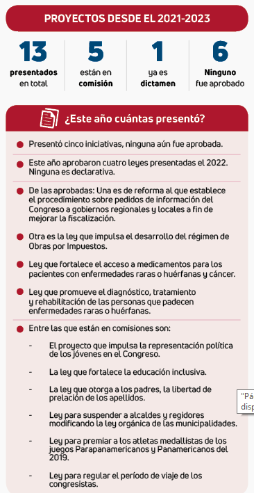 Sobre sus proyectos de ley, en este año presentó cinco y ninguno fue aprobado, mas sí en el 2022 fueron presentadas cuatro normas de su autoría que en 2023 fueron aprobadas..