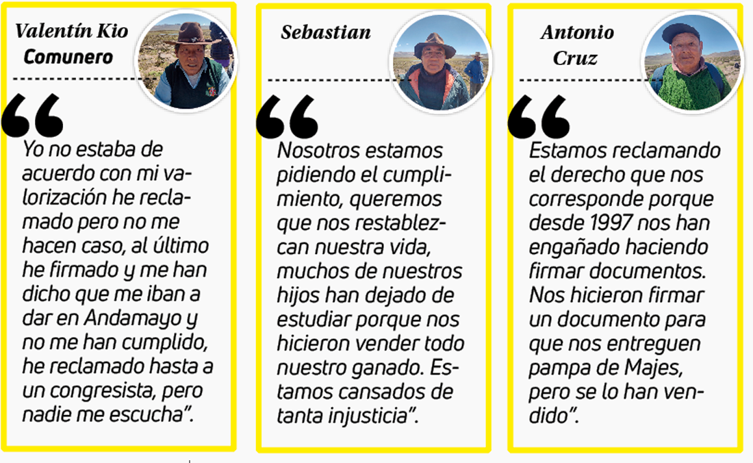 Inicialmente, a pesar de la pena de alejarse del lugar donde vivió desde niño, no quiso frenar el desarrollo de la región y cedió su terreno, pero además hubo la promesa plasmada en un convenio donde les indicaban que serían reubicados al asentamiento PB3 Pampa Baja de Majes, promesa que hasta ahora no se cumple.