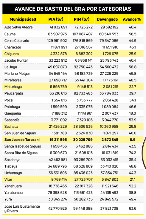 De otro lado, según detalla el portal de Transparencia Económica, la municipalidades de Santa Rita de Siguas (74.8 %), José Luis Bustamante y Rivero (63.6 %), así como La Joya (58.9 %), son las entidades que presentan un mayor avance de su dinero en gastos generales, es decir, en categorías como: pago de planillas, deuda pública, prestaciones sociales, bienes, servicios, donaciones y adquisición de activos no financieros (proyectos de inversión).