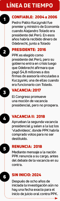 El vínculo de PPK y Odebrecht salió a la luz en 2016, cuando asumió la presidencia del país. En ese año la compañía extranjera afirmó que pagó $4.8 millones a dos firmas de asesorías que tenía como accionista al exmandatario. A más de ocho años, el fiscal a cargo de la investigación, José Domingo Pérez, estima que su juicio oral inicie en diciembre de este año, pero aún nada es confirmado.