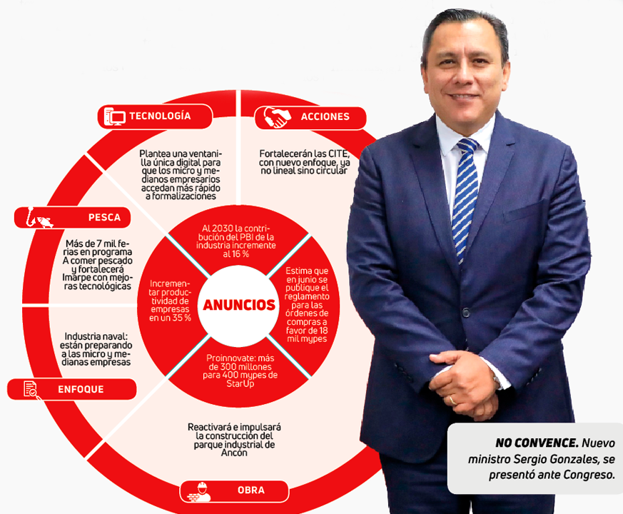 Uno de los sectores con más cambios en el gobierno de Dina Boluarte es el Ministerio de la Producción, que hasta la fecha tuvo cuatro titulares, siendo el último Sergio Gonzalez Guerrero, quien está 20 días liderando la cartera. En su exposición en la Comisión de Producción, micro y pequeñas empresas del Congreso, no supo precisar cronogramas ni objetivos de su gestión, por el contrario cayó en generalidades.