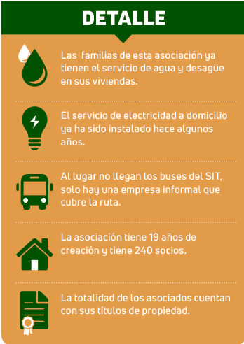 A la fecha todos cuentan con títulos de propiedad. En sus viviendas tienen los servicios de luz, agua y desagüe, pero junto con ello vienen arrastrando un problema y riesgo constante de contaminación debido a que todos los años en los meses de lluvias las tuberías y buzones son carcomidos y quedan totalmente expuestos.
