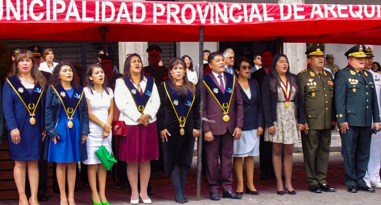 La ceremonia especial fue presidida por el alcalde provincial Víctor Hugo Rivera, junto a las regidoras provinciales, alcaldesas distritales, la prefecta de Arequipa, en compañía de jefes militares y policiales.