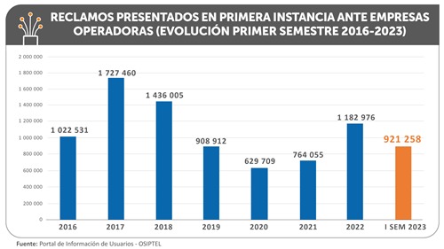 En el primer semestre de 2023 se registraron 921 258 reclamos presentados por los usuarios ante las empresas operadoras, en primera instancia, por inconvenientes con los servicios de telefonía fija, móvil, internet, televisión de cable, empaquetados (dúos o tríos) y otros; 22.12 % menos frente a los reclamos reportados en similar periodo de 2022 (1 182 976), informó el Organismo Supervisor de Inversión Privada en Telecomunicaciones (Osiptel).