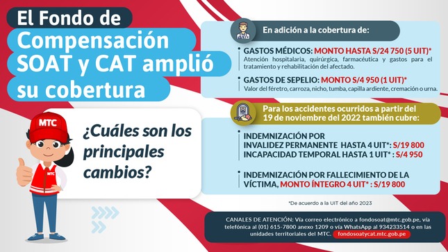 El Fondo de Compensación del SOAT (Seguro Obligatorio de Accidentes de Tránsito) y del CAT (Certificado contra Accidentes de Tránsito) del Ministerio de Transportes tiene reembolsos que llegan hasta los S/24 750 (5 UIT) por persona para cubrir los gastos de atención hospitalaria, quirúrgica, farmacéutica y otros que sean necesarios para el tratamiento y rehabilitación de la víctima. Ello se realiza mediante la devolución al beneficiario o directamente al centro de salud que atendió al accidentado.