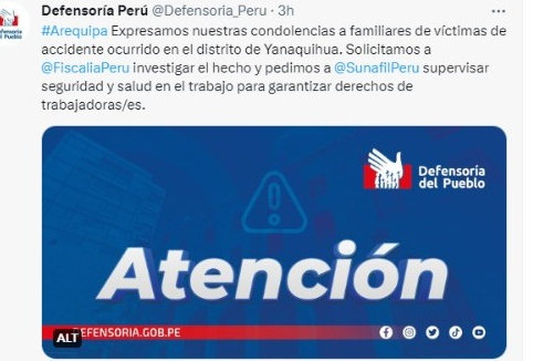 "Expresamos nuestras condolencias a los familiares y al pueblo de Arequipa por la muerte de los 27 mineros, hecho ocurrido en el sector de Yanaquihua, provincia de Condesuyos en Arequipa", se lee en un mensaje en la cuenta oficial de Twitter de la Presidencia de la República.