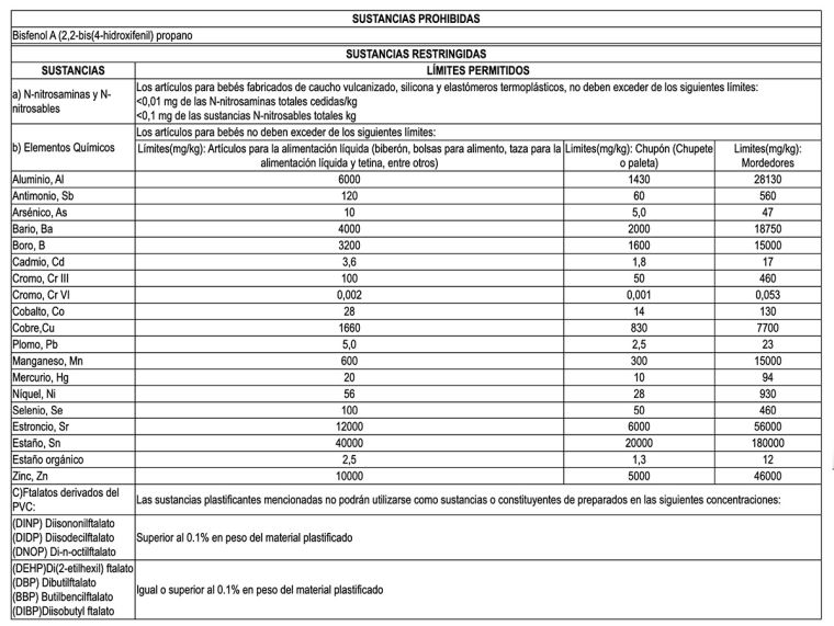 LISTADO. La medida recalca que los materiales empleados para la fabricación de dichos artículos deben ser seguros y no contener sustancias prohibidas o restringidas, como elementos químicos y ftalatos derivados PVC, es decir plástico, que representen un riesgo o peligro para la salud del bebé.