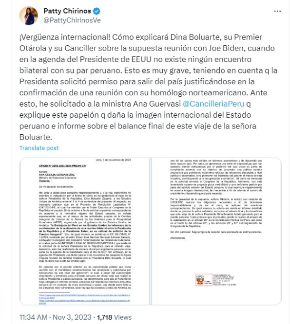 La parlamentario Patricia Chirinos también calificó como 'vergüenza internacional' lo que pasaba en Estados Unidos, por ello envió un ofició al Ministerio de Relaciones Exteriores para que "explique el papelón que daña la imagen internacional del Estado peruano e informe sobre el balance final del viaje".