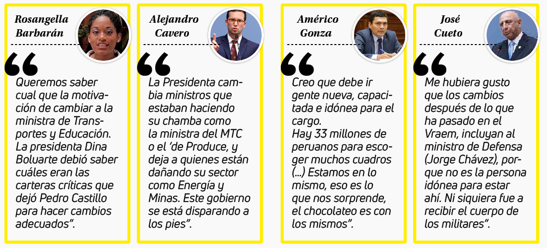 Las reacciones de los congresistas fueron críticas por la renuncia de Magnet Márquez  y también por sacar a Paola Lazarte quien presidía Transportes. Desde Fuerza Popular, Renovación Popular, Perú Libre y parte de Alianza para el Progreso, indicaron que debieron cambiar al ministro del Interior, Vicente Romero y el de Defensa, Jorge Chávez Cresta.