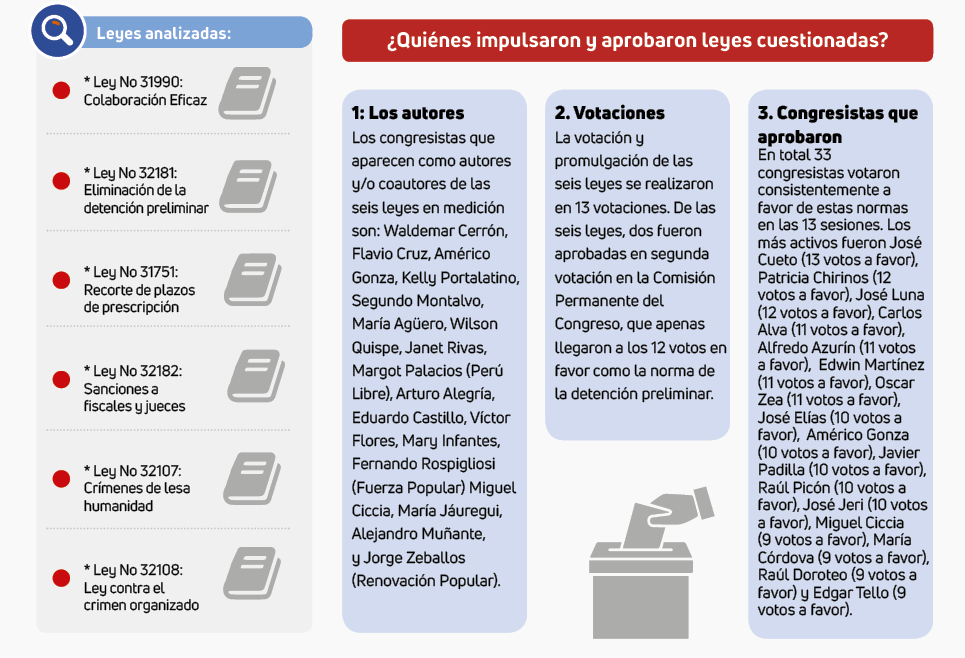 Un estudio de la escuela de gobierno de la Pontificia Universidad Católica del Perú (PUCP) detalló cómo se dieron las votaciones y quiénes respaldaron estas leyes, que en lugar de luchar contra la inseguridad ciudadana, solo complica la situación.
