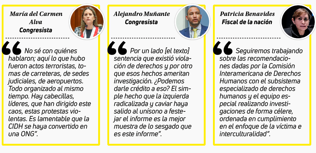 La jefa de Estado refirió que en cinco días la CIDH no pudo haber recogido todos los testimonios, desestimando las conclusiones. Mientras que el premier Alberto Otárola fue más crítico, al recordar a la CIDH “su papel como organismo internacional de toda la población y no solo de los que reclaman un cambio de política”.