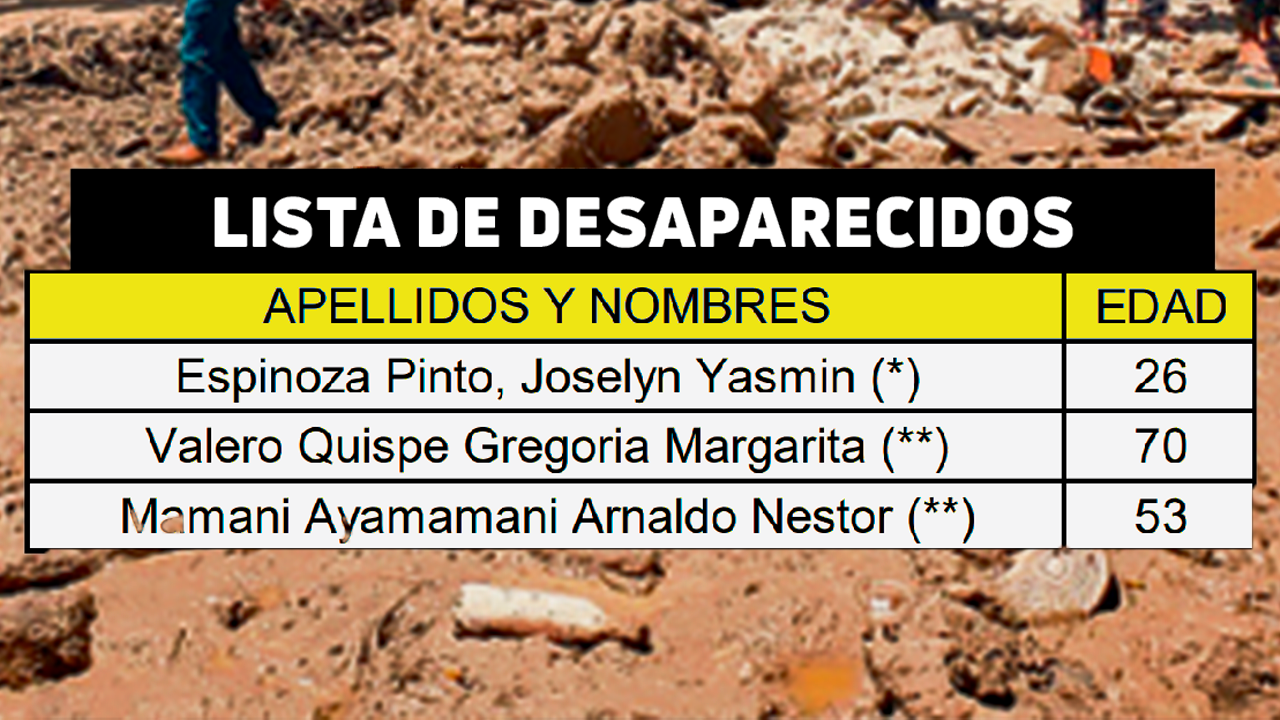 SIGUEN DESAPARECIDOS. Luego del último hallazgo de un cuerpo encontrado hace tres días durante labores de limpieza y habilitación de la transitabilidad, Suclla no descartó nuevos descubrimientos, ya que a la fecha se reporta cerca de 20 desaparecidos, de los cuales solo existre un registro formal de 3 (ver cuadro).