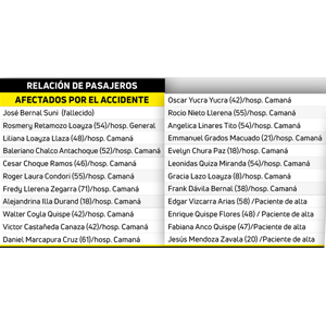El vehículo de carga pesada de placa B7T-820, que se dirigía del norte del Perú hasta Arequipa transportaba atunes que quedaron regados por toda la pampa. Por su lado el bus de placa Z7J-960 conducido por Leonidas Benito Quisa, se dirigía de Camaná hasta Arequipa quedando destrozado de la parte lateral izquierdo por la colisión. La víctima mortal era un comunicador de espectáculos de nombre Josefat Bernal Suni.